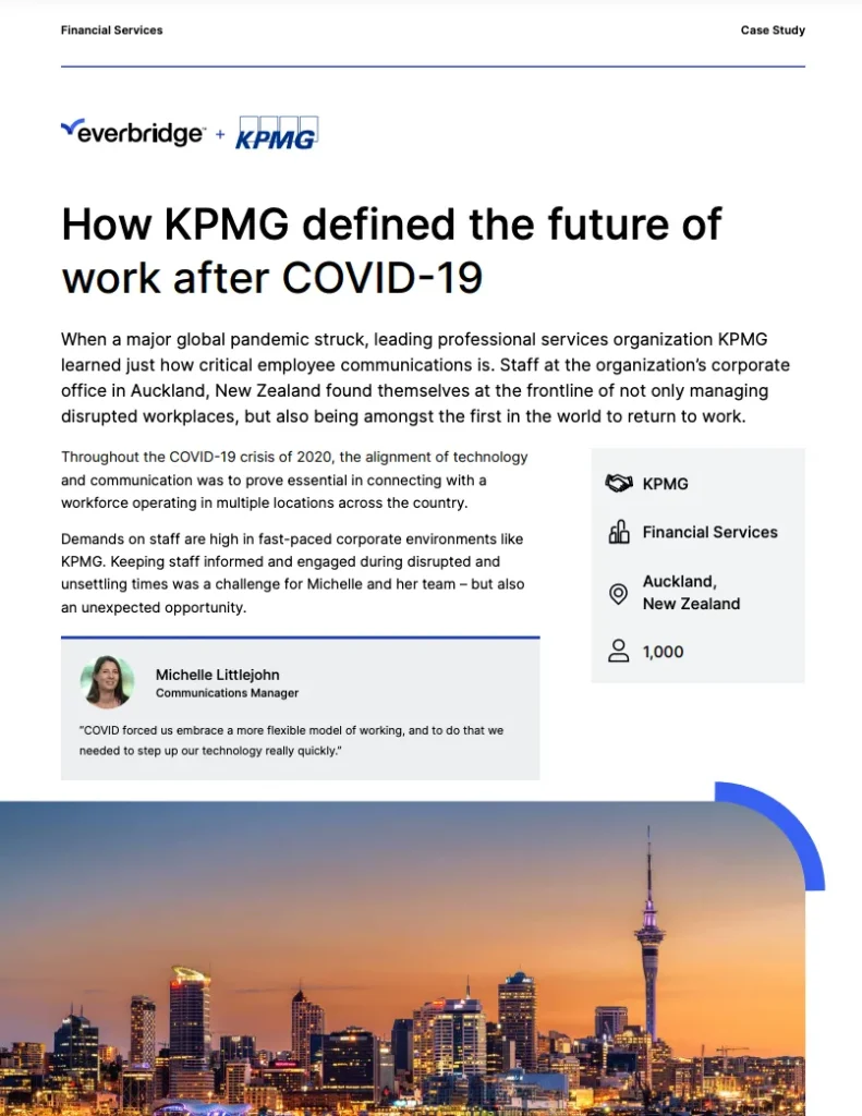 - How KPMG defined the future of work after COVID-19: learn from industry leaders as they share insights and lessons learned in adapting to the post-pandemic work environment.