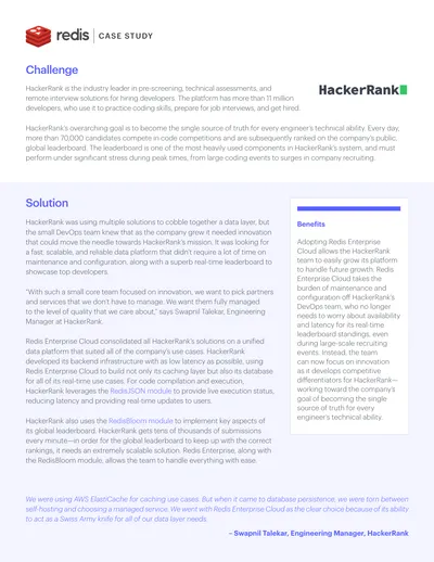 Adopting Redis Enterprise Cloud allows the HackerRank team to easily grow its platform to handle future growth. Redis Enterprise Cloud takes the burden of maintenance and configuration off HackerRank’s DevOps team, who no longer needs to worry about availability and latency for its real-time leaderboard standings, even during large-scale recruiting events. Instead, the team can now focus on innovation as it develops competitive differentiators for HackerRank—working toward the company’s goal of becoming the single source of truth for every engineer’s technical ability.