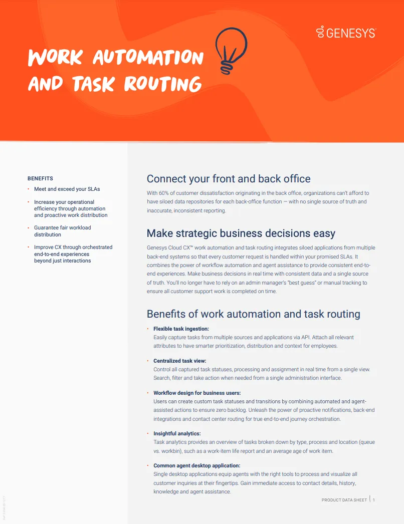 Genesys Cloud CX™ work automation and task routing integrates siloed applications from multiple back-end systems so that every customer request is handled within your promised SLAs. It combines the power of workflow automation and agent assistance to provide consistent end-to-end experiences. Make business decisions in real time with consistent data and a single source of truth. You’ll no longer have to rely on an admin manager’s “best guess” or manual tracking to ensure all customer support work is completed on time.